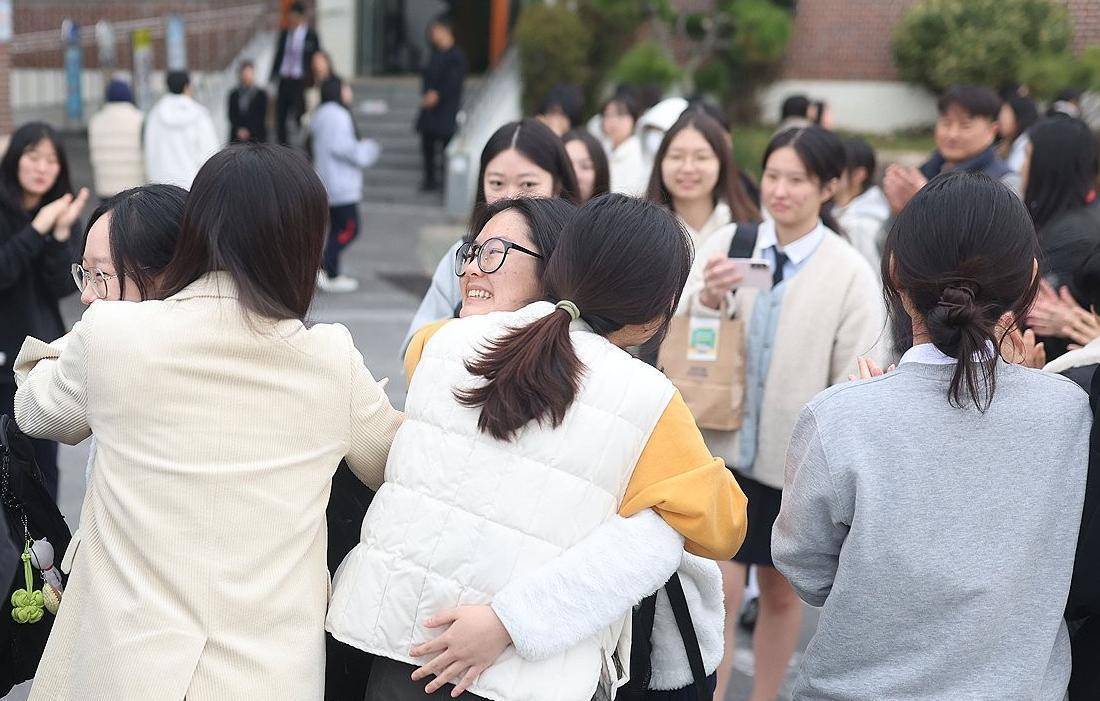 11月12日,在韩国庆尚南道昌原市的一个女子高中,老师们挨个拥抱高三学生,为其加油助威。韩联社图片据韩联社报道,考试时间为8时40分至17时45分,考试顺序按照韩国语、数学、英语、韩国史及探索(社会/科学/职业)、第二外语或中文5门科目的顺序进行。考试维持自2022年开始的文理科合并模式,排除超高难度试题。本次高考成绩将于12月5日公布。