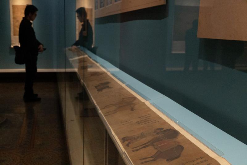 北京青年报记者在展览现场采访了解到,展览首次展出了唐人(传)《百马图》卷。这幅长图卷以连续画面,描绘了43名牧人牧养95匹官马的情形,依次有刷浴、饲喂、养猕猴避瘟、驯马及马匹装具等场景。