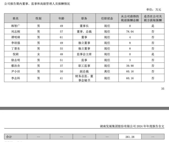 2024年年报显示,公司董事、监事和高级管理人员2024年报酬总额261.26万元。董事长韩智广2024年从公司获得的税前报酬总额为0,在公司关联方获取报酬。董事、总裁刘志刚2024年从公司获得的税前报酬总额为78.04万元,未在公司关联方获取报酬。财务总监、董事会秘书李志科2024年从公司获得的税前报酬总额为60.16万元,未在公司关联方获取报酬。