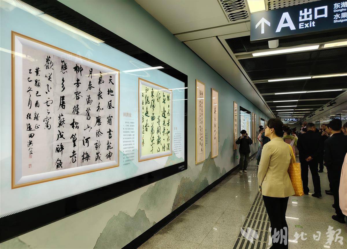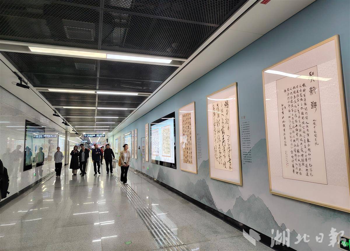 该艺术空间位于地铁8号线水果湖站站厅及通道区域,首期展出弘堂书社成员的书法作品近30幅,涵盖篆、隶、楷、行、草多种书体。与常规美术馆不同,该空间采用开放式、通勤化设计,路过的乘客可随时驻足观赏。